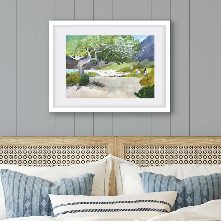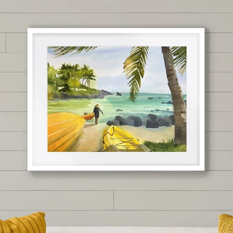 Half-sheet-sized watercolor paintings are approximately 22.5 inches wide by 15 inches tall. Each half-sheet painting comes professionally framed and matted with an acid-free matte, backing board, and UV-protective glass. The framed artwork (finished size) is approximately 28.5 inches wide by 21.5 inches tall. Each piece is hand-signed and comes with a certificate of authenticity.